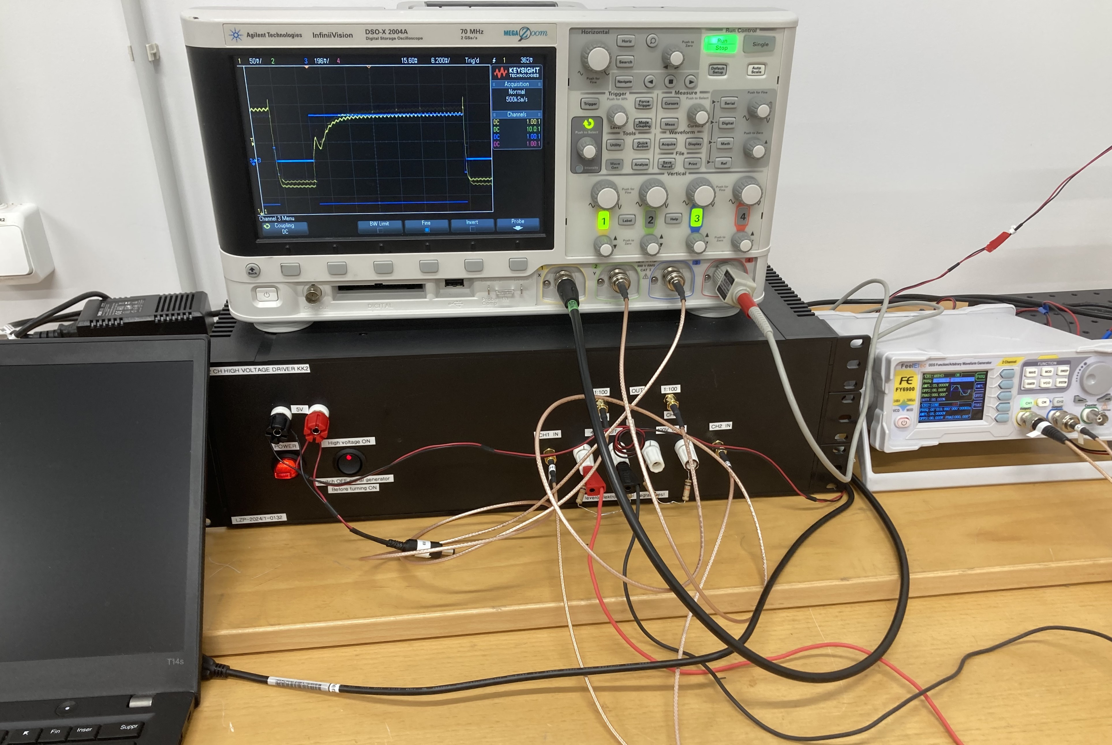 The image shows device testing with a two-channel high-voltage amplifier.