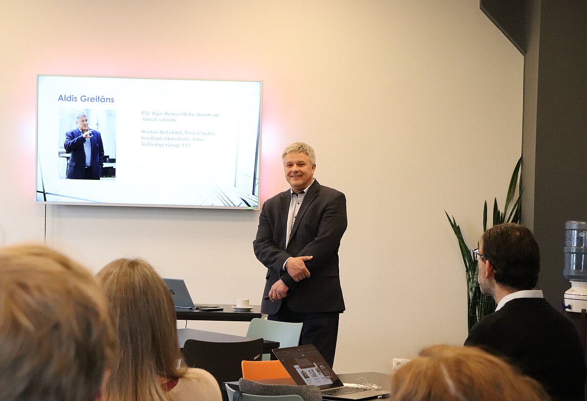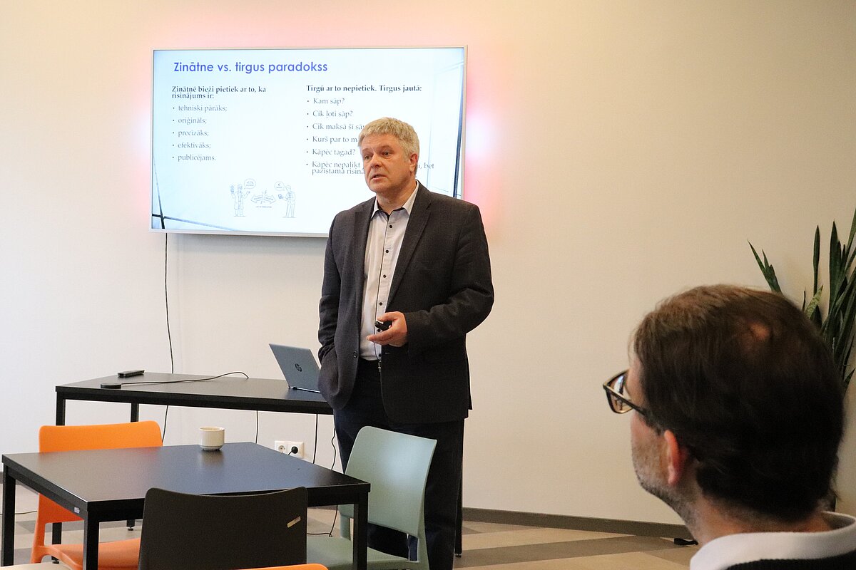 Vieslektors Aldis Greitāns, pieredzējis vadītājs un RTU Rīgas Biznesa skolas docents, savā prezentācijā pievērsās "Zinātne vs. Tirgus" paradoksam. Viņš skaidroja, kāpēc pat izcilākie atklājumi ne vienmēr automātiski kļūst par komerciāliem panākumiem, un uzsvēra nepieciešamību kvantificēt vērtības piedāvājumu – tulkot sarežģītus tehniskos parametrus valodā, ko saprot investori un klienti, piemēram, ietaupīts laiks vai samazināts risks.
