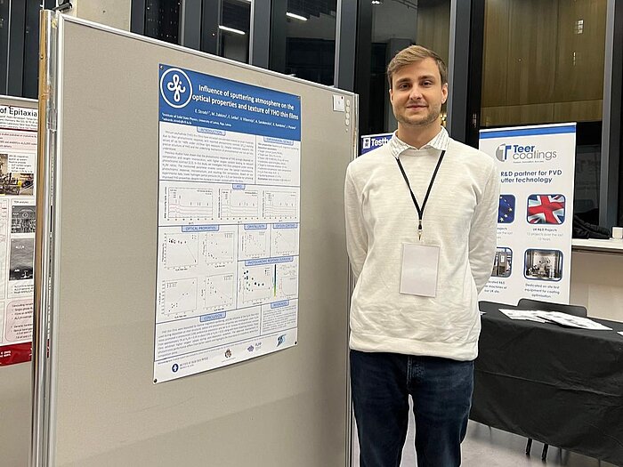 No 16. līdz 17. decembrim projektā strādājošais doktorants Mg.eng. Edvards Strods piedalījās starptautiskā konferencē Reactive Sputter Deposition 2025, kas norisinājās Mančestrā, Lielbritānijā. Konferencē tika prezentēts stenda referāts “Influence of Sputtering Atmosphere on the Optical Properties and Texture of YHO Thin Films”, kurā tika atspoguļoti šajā projektā iegūtie rezultāti (attēlā).