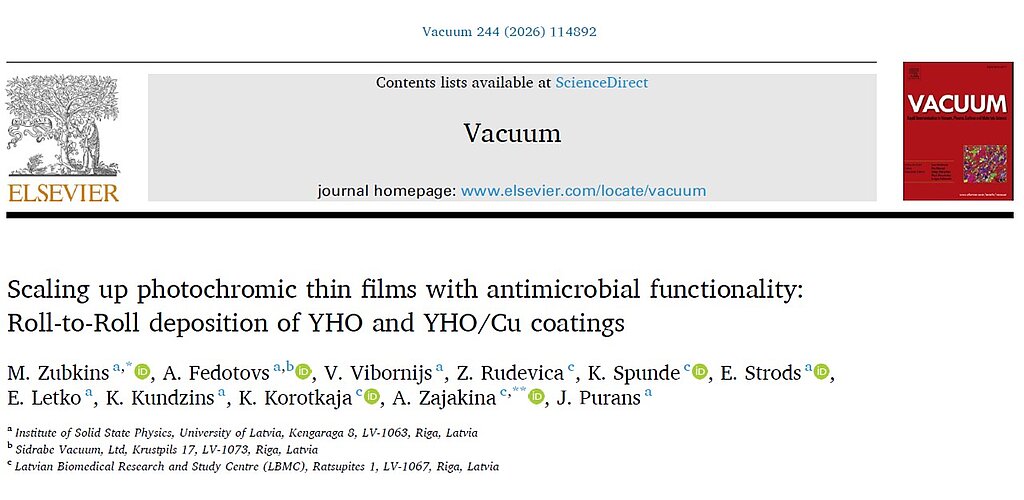 7. novembrī tika publicēts zinātnisks raksts “Scaling up photochromic thin films with antimicrobial functionality: Roll-to-Roll deposition of YHO and YHO/Cu coatings”, žurnālā Vacuum 244 (2026) 114892 (attēlā) sadarbībā ar kompāniju Sidrabe Vacuum un Latvijas Biomedicīnas Pētījumu un Studiju centru (LBMC).